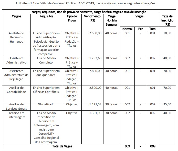 O cargo de assistente administrativo, nível médio, antes ofertava quatro vagas de ampla concorrência e, após o edital de retificação, oferta apenas duas. Estavam disponíveis três oportunidades para auxiliar de serviços gerais, cujo único requisito é ser alfabetizado, e agora foram reduzidos para dois. O número de vagas dos demais cargos, assim como as outras informações dos cargos modificados, continuam mantidas. Deste modo, de 12 vagas, a oferta do concurso diminui para nove.